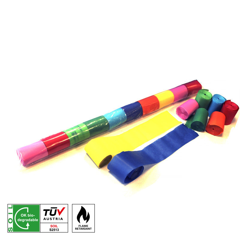 Streamers i ulike farger til fester, bursdager, bryllup, arrangementer, konserter, festivaler og andre forhold, til privat og profesjonelt bruk. Flammesikre streamers for profesjonell bruk. Tilgjengelig i polyposer à 10stk. Bestillingsbeløp/pris er per: 1 polypose | Full eske er: 25 polyposer