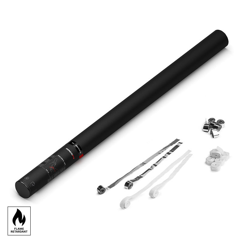 80cm konfettirør med metallisk streamers. Metallisk streamers til fester, bursdager, bryllup, arrangementer, konserter, festivaler og andre forhold. Flammesikre streamers i håndholdt kanon for profesjonell og privat bruk. Skyt streamers opp i luften med dette håndholdte streamerskytespillet. Denne 80cm kanonen kan skyte flammesikker streamers opp til 20 meter. Hold kanonen i hånden og vri.